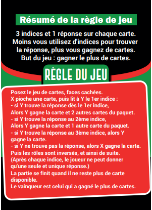 REGLE DE JEUC’est la même règle de jeu pour tous les thèmes des quiz Conficulture qui existent. Résumé de la règle de jeu 3 indices et 1 réponse sur chaque carte. Moins vous utilisez d'indices pour trouver la réponse, plus vous gagnez de cartes. But du jeu : gagner le plus de cartes Règle du jeu Posez le jeu de cartes, faces cachées. X pioche une carte, puis lit à Y le 1er indice : - si Y trouve la réponse dès le 1er indice, Alors Y gagne la carte et 2 autres cartes du paquet. - si Y trouve la réponse au 2ème indice, Alors Y gagne la carte et 1 autre carte du paquet. - si Y trouve la réponse au 3ème indice, alors Y gagne la carte. - si Y ne trouve pas la réponse, alors X gagne la carte. Puis les rôles sont inversés, et ainsi de suite. (Après chaque indice, le joueur ne peut donner qu'une seule et unique réponse.) La partie se finit quand il ne reste plus de carte disponible. Le vainqueur est celui qui a gagné le plus de cartes.